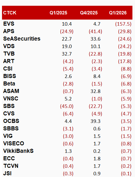 Bức tranh lại nhuốm màu ảm đạm khi số CTCK báo lỗ lên tới 21. Chứng khoán Everest (EVS) gây bất ngờ khi ghi nhận mức lỗ nặng nhất với 157.5 tỷ đồng trong quý 1 năm 2026, trong khi cùng kỳ và quý liền trước vẫn đang có lãi. Các đơn vị khác như Chứng khoán Alpha (APS), Chứng khoán Asean và Chứng khoán Rồng Việt (VDS) cũng rơi vào tình trạng thua lỗ với các mức tương ứng là 29.8 tỷ đồng, 24.6 tỷ đồng và 24.2 tỷ đồng.