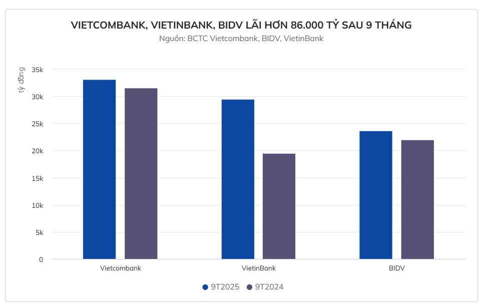 Khép lại 3 quý kinh doanh của năm 2025, BIDV, VietinBank, Vietcombank – bộ 3 ngân hàng lớn nhất Việt Nam – đã lãi tổng cộng hơn 86.000 tỷ đồng, tương đương gần 3,3 tỷ USD quy đổi.