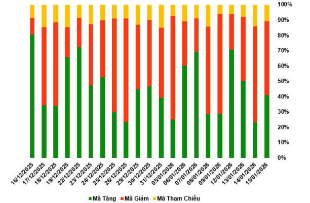 Kết thúc phiên giao dịch ngày 15/01/2026, toàn thị trường có 110 mã tăng, 130 mã giảm và 29 mã tham chiếu. Khối ngoại tiếp tục bán ròng với tổng...