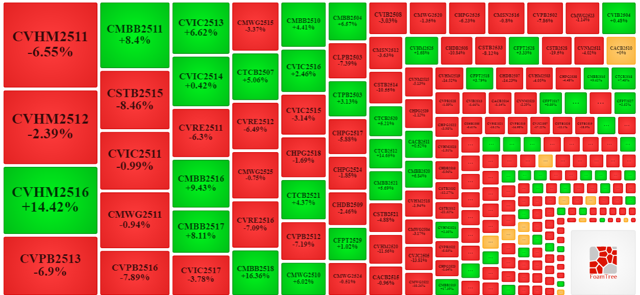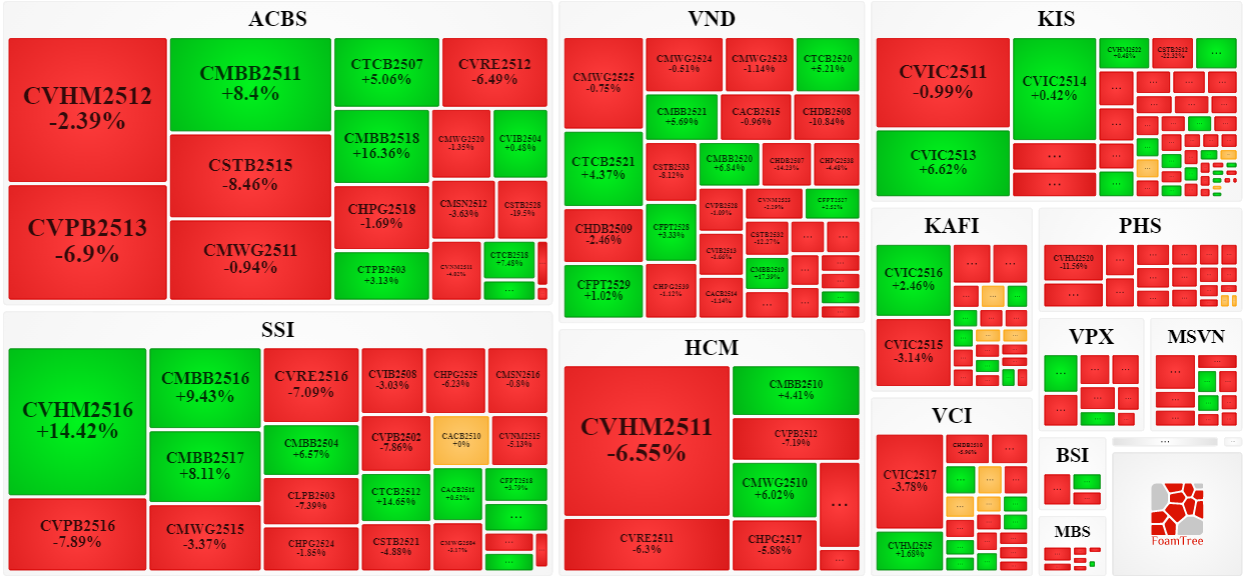 Trong phiên giao dịch ngày 09/01/2025, bên bán tiếp tục áp đảo thị trường khiến phần lớn các mã chứng quyền giảm giá. Cụ thể, các mã chứng quyền lớn trong nhóm giảm giá là CVHM2511, CVHM2512, CVPB2513, CSTB2515 và CVIC2511.