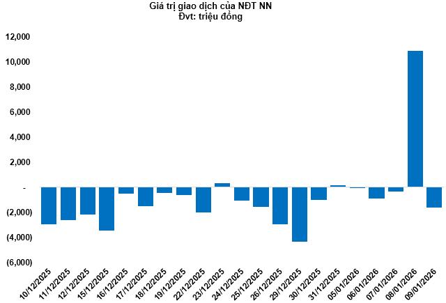 Kết thúc phiên giao dịch ngày 09/01/2026, toàn thị trường có 71 mã tăng, 159 mã giảm và 15 mã tham chiếu. Khối ngoại quay lại bán ròng với tổng mức bán ròng đạt 1.66 tỷ đồng.
