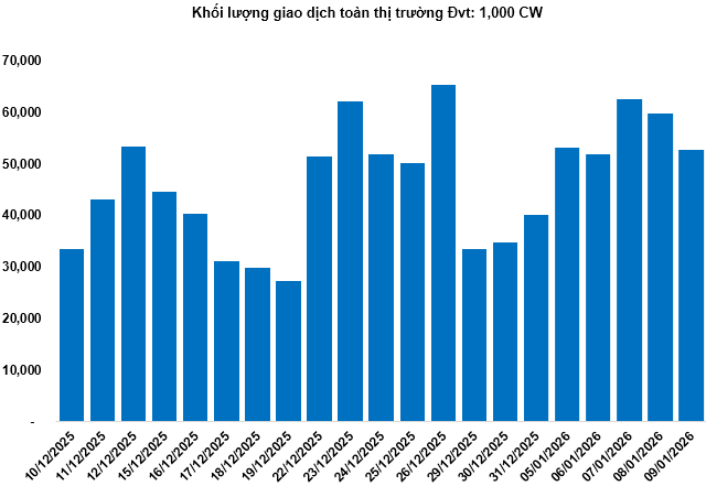 Khối lượng giao dịch toàn thị trường trong phiên 09/01 đạt 52.77 triệu CW, giảm 11.73%; giá trị giao dịch đạt 94.97 tỷ đồng, giảm 29.3% so với phiên 08/01. Trong đó, CSTB2528 là mã dẫn đầu thị trường về khối lượng và giá trị giao dịch, với tổng khối lượng đạt 3.47 triệu CW, tương đương giá trị 5.75 tỷ đồng.