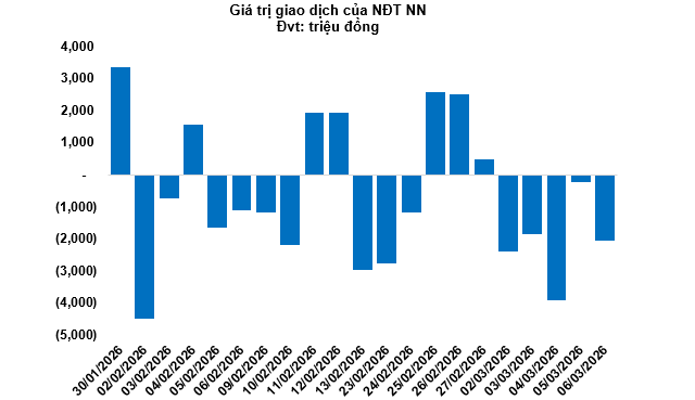 Kết thúc phiên giao dịch ngày 06/03/2026, toàn thị trường có 40 mã tăng, 235 mã giảm và 28 mã tham chiếu. Khối ngoại tiếp tục bán ròng với tổng mức bán ròng đạt 2.04 tỷ đồng.