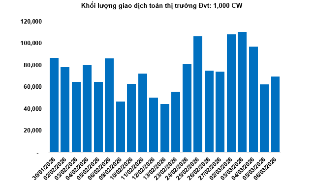 Khối lượng giao dịch toàn thị trường trong phiên 06/03 đạt 69.81 triệu CW, tăng 11.64%; giá trị giao dịch đạt 88.02 tỷ đồng, giảm 4.66% so với phiên 05/03. Trong đó, CMSN2521 là mã dẫn đầu thị trường về khối lượng với 7.02 triệu CW; CSTB2532 dẫn đầu về giá trị giao dịch với 4.96 tỷ đồng.