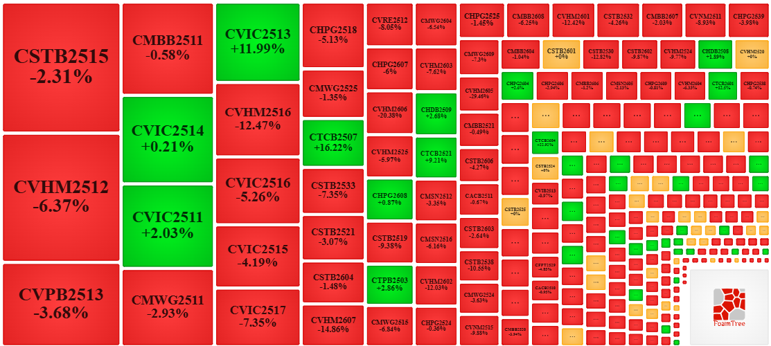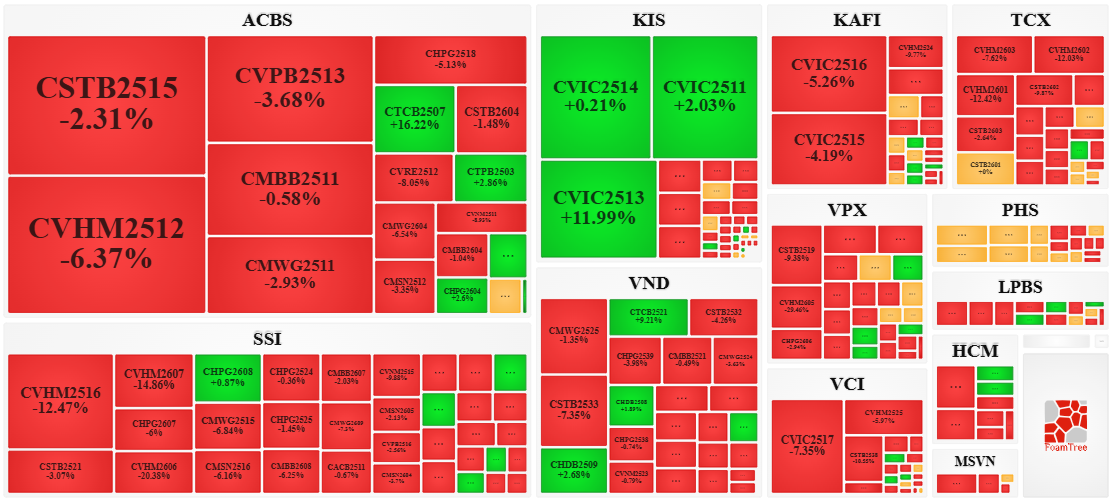 Trong phiên giao dịch ngày 24/04/2026 bên bán áp đảo thị trường khiến phần lớn các mã chứng quyền giảm giá. Cụ thể, các mã chứng quyền lớn trong nhóm giảm giá là CSTB2515, CVHM2512, CVPB2513 và CMBB2511.