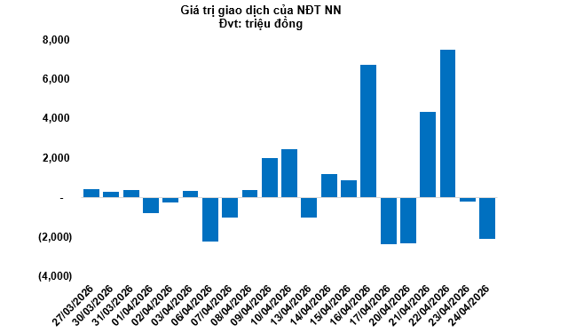 Kết thúc phiên giao dịch ngày 24/04/2026, toàn thị trường có 41 mã tăng, 183 mã giảm và 41 mã tham chiếu. Khối ngoại tiếp tục bán ròng với tổng mức bán ròng đạt 2.1 tỷ đồng.