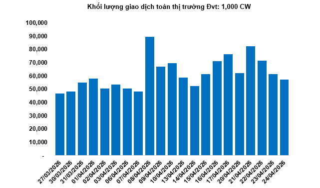 Khối lượng giao dịch toàn thị trường trong phiên 24/04 đạt 57.2 triệu CW, giảm 6.56%; giá trị giao dịch đạt 81.11 tỷ đồng, tăng 12.52% so với phiên 23/04. Trong đó, CHPG2607 là mã dẫn đầu thị trường về khối lượng và giá trị giao dịch, với tổng khối lượng đạt 4.71 triệu CW, tương đương giá trị 6.4 tỷ đồng.