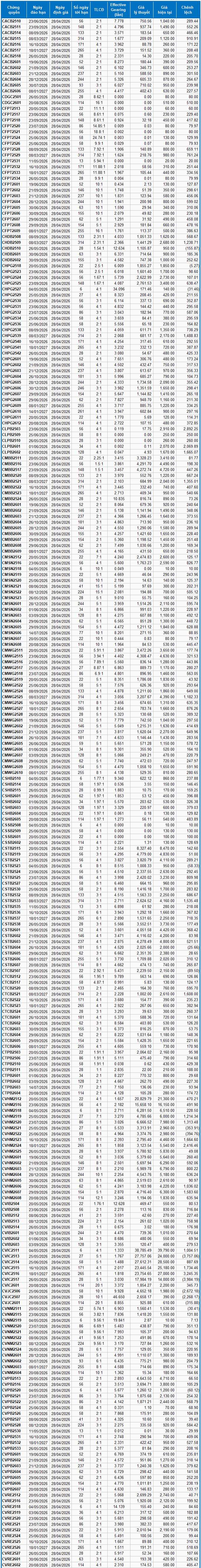 Dựa trên phương pháp định giá chứng quyền Black-Scholes với thời điểm khởi đầu là ngày 28/04/2026, số liệu thống kê của chứng quyền đang được niêm yết và giao dịch trên thị trường được thể hiện như sau: