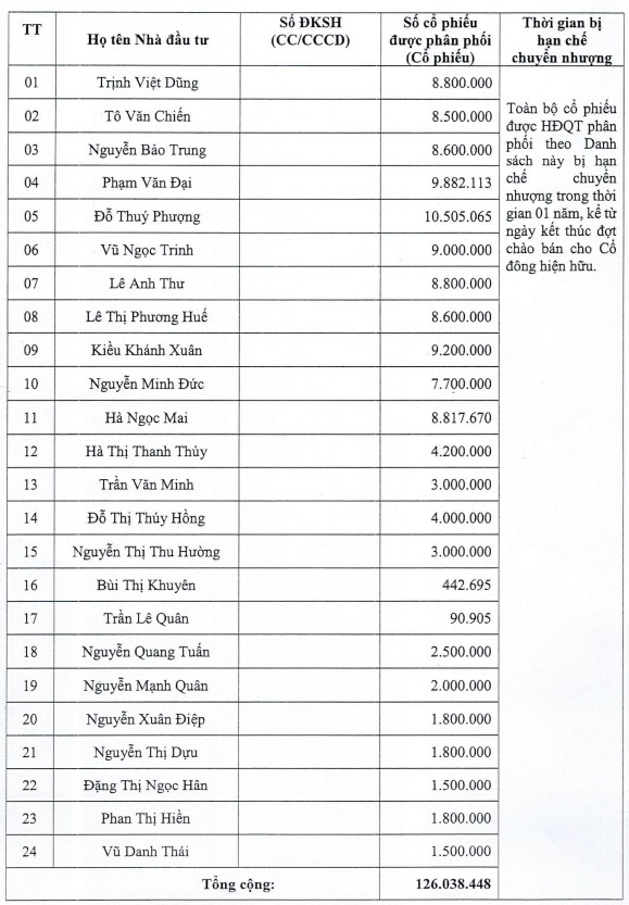 Danh sách 24 nhà đầu tư được phân bổ số lượng cổ phiếu chưa bán hết