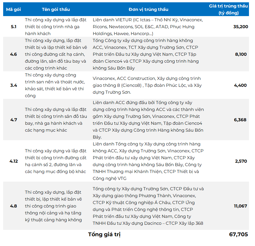 Ngoài gói thầu 5.10 lớn nhất, tháng 8/2023, Vinaconex còn góp mặt trong nhiều gói thầu khác ở Sân bay Long Thành, bao gồm gói 4.6, gói 4.7, gói 4.12, gói 4.8 và gói 3.4. Tính gộp chung, các gói thầu này có tổng giá trị gần 68 ngàn tỷ đồng.