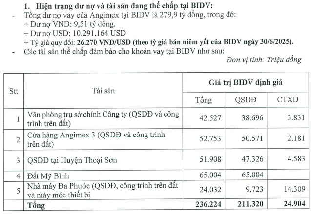 Khoản nợ BIDV gần 280 tỷ đồng với tài sản thế chấp hơn 236 tỷ đồng như đất Mỹ Bình, Cửa hàng Angimex 3, quyền sử dụng đất tại Thoại Sơn… Theo Nghị quyết ĐHĐCĐ 2024, Công ty đã được phê duyệt bàn giao tài sản để xử lý nợ nhưng chưa thể hoàn tất vì thiếu đối tác và biến động nhân sự. HĐQT đề xuất phối hợp BIDV tiếp tục xử lý tài sản thế chấp, giao HĐQT toàn quyền và đặt hạn chót hoàn thành trong quý 4/2026.