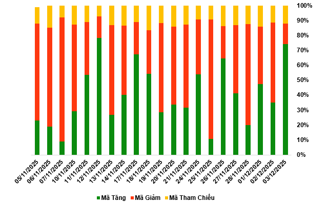 Kết thúc phiên giao dịch ngày 03/12/2025, toàn thị trường có 203 mã tăng, 38 mã giảm và 33 mã tham chiếu. Khối ngoại quay lại mua ròng với tổng...