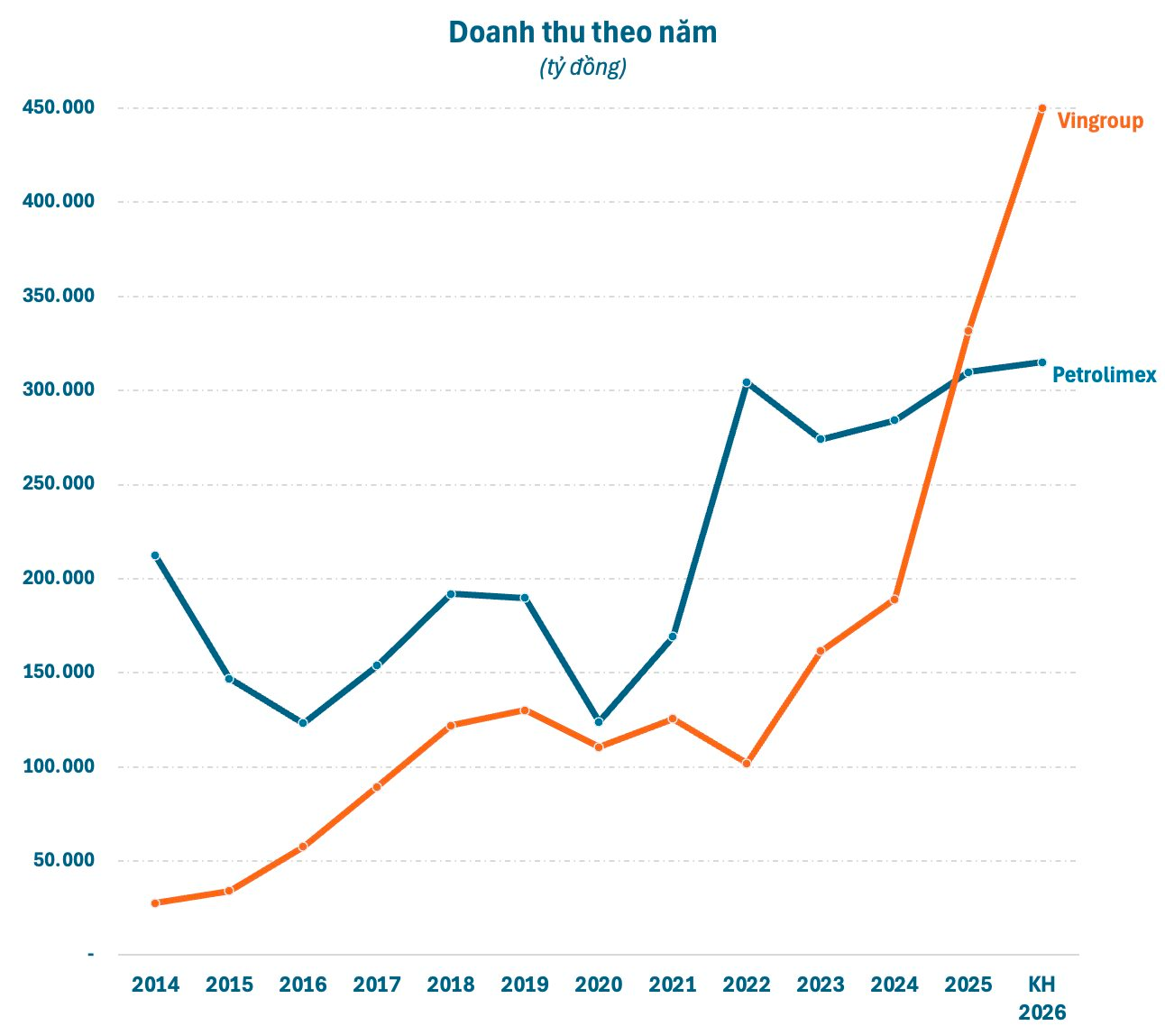Nhiều năm qua, “đại gia” bán lẻ xăng dầu Petrolimex (mã PLX) gần như “vô địch” sàn chứng khoán Việt Nam về chỉ tiêu doanh thu. Cho đến năm ngoái, lần đầu tiên Petrolimex bị soán ngôi bởi Vingroup – tập đoàn đa ngành của tỷ phú Phạm Nhật Vượng. Thậm chí, khoảng cách về doanh thu giữa 2 tập đoàn còn có thể bị nới rộng đáng kể trong năm 2026.