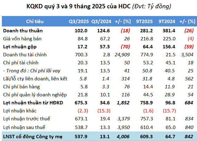 Cộng với kết quả nửa đầu năm, doanh thu thuần 9 tháng hơn 281 tỷ đồng, giảm 26%; trong khi lợi nhuận sau thuế hơn 610 tỷ đồng, gấp 9.4 lần. So với kế hoạch 2025, HDC mới thực hiện được 19% mục tiêu doanh thu, nhưng đã vượt 44% chỉ tiêu lợi nhuận.