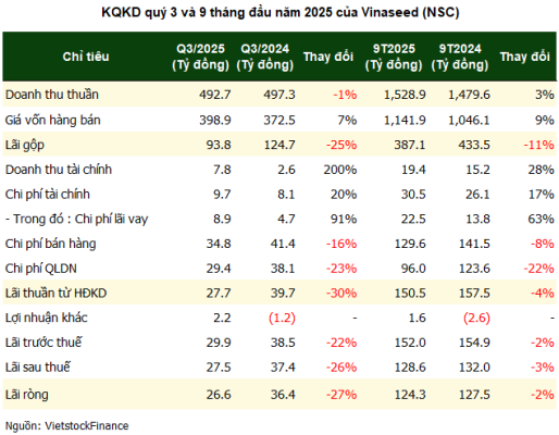 Do chi phí lãi vay tăng và biên lãi gộp thu hẹp, Vinaseed chỉ ghi nhận lãi ròng hơn 124 tỷ đồng sau 9 tháng, giảm 2% so với cùng kỳ, dù doanh thu tăng 3% lên gần 1,529 tỷ đồng – mức cao nhất lịch sử theo chu kỳ 9 tháng. Công ty đã thực hiện 56% kế hoạch doanh thu và 49% chỉ tiêu lợi nhuận cả năm.