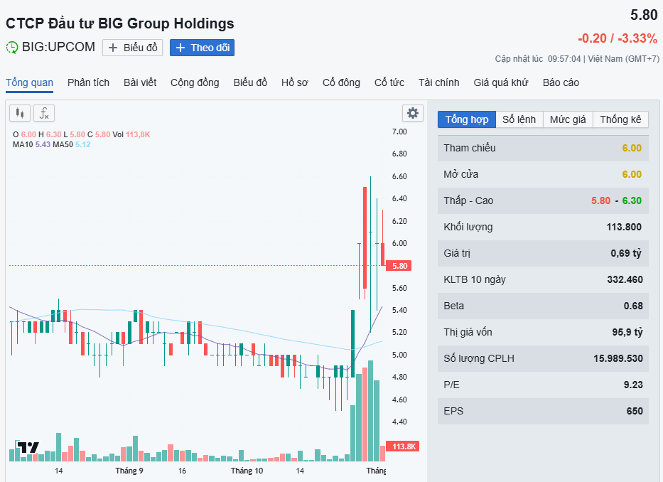 Trong tuần giao dịch cuối tháng 10, cổ phiếu BIG của CTCP Đầu tư Big Group Holdings gây nhiều chú ý với đà tăng 25%, từ 4,800 đồng/cp lên 6,000 đồng/cp. Thanh khoản cũng tăng đột biến với bình quân 634 ngàn cp/ngày, mức kỷ lục nhiều tháng qua.