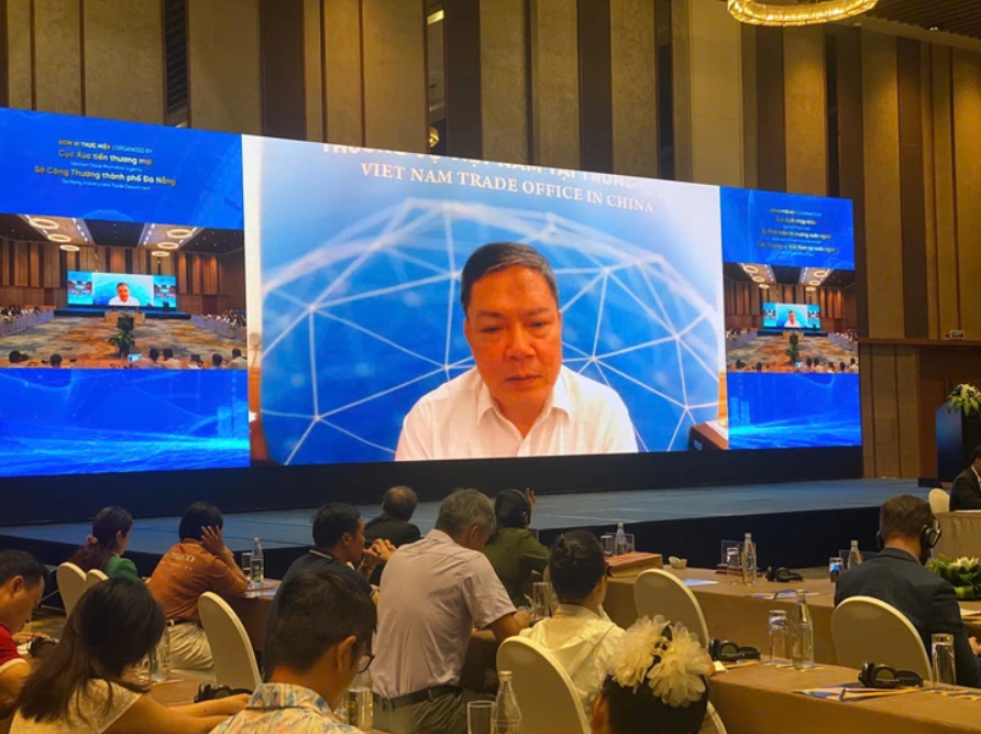 Ông Nông Đức Lai, Tham tán Thương vụ Việt Nam tại Trung Quốc, phát biểu trực tuyến sáng 2-10 – Ảnh: B.D.