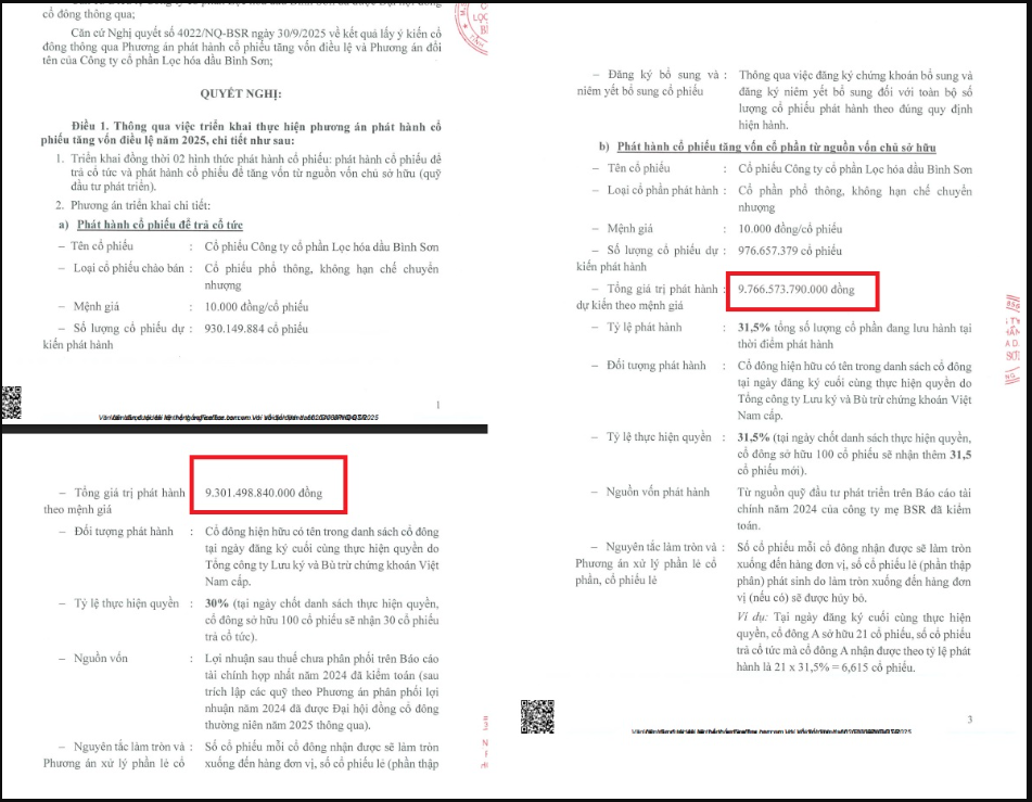 Tỷ lệ thực hiện quyền là 31,5% – tức cổ đông sở hữu 100 cổ phiếu sẽ nhận thêm 31,5 cổ phiếu mới. Nguồn vốn phát hành từ quỹ đầu tư phát triển trên báo cáo tài chính 2024 của công ty mẹ BSR đã kiểm toán.