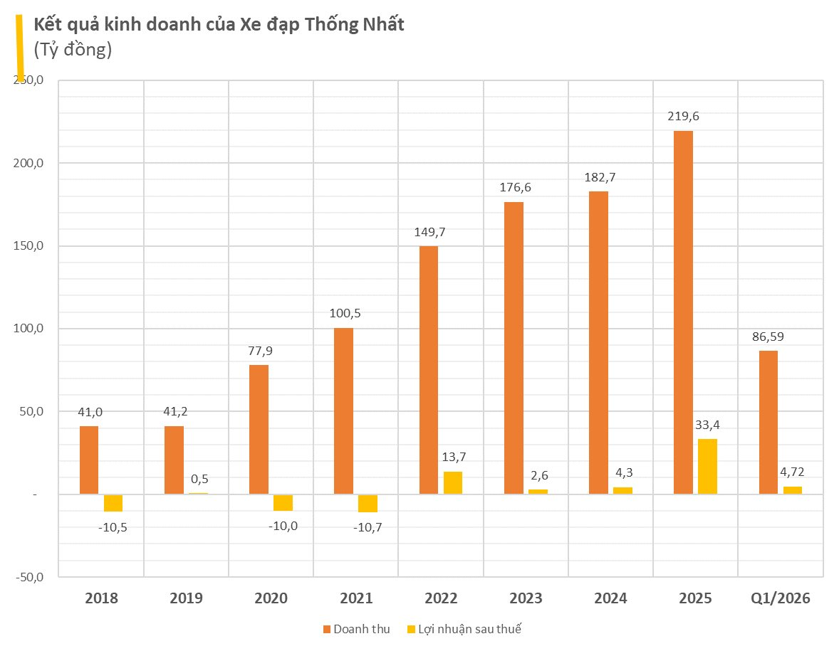 Về kết quả kinh doanh, trong vòng 7 năm từ 2019-2025, doanh thu của xe đạp Thống Nhất đã liên tục tăng trưởng, năm 2025, doanh thu của công ty tăng 20% so với năm trước, lợi nhuận tăng đột biến lên mức hơn 33 tỷ đồng.