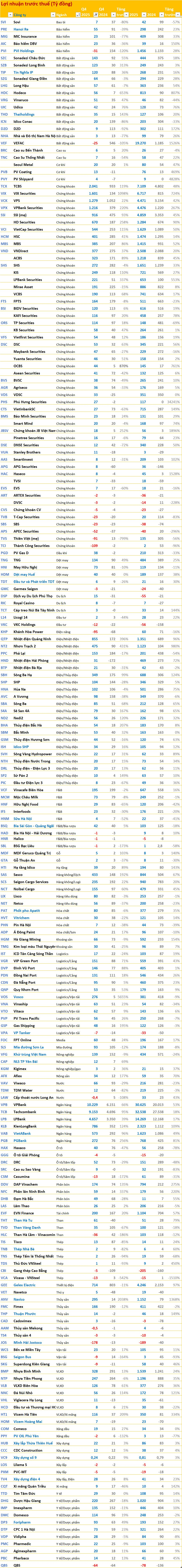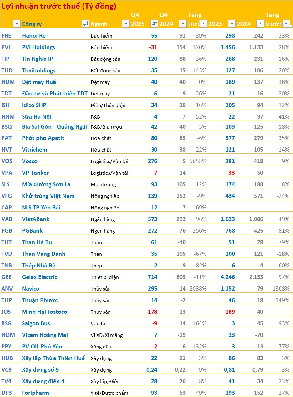 Ở khối Ngân hàng, PGBank (PGB) ghi nhận quý 4 lãi 272 tỷ đồng, tăng trưởng 256%. Tính chung cả năm 2025, PGBank đạt 768 tỷ đồng lãi trước thuế, tăng trưởng 81%. VietABank (VAB) cũng đóng góp con số lãi năm ấn tượng đạt 1.623 tỷ đồng.