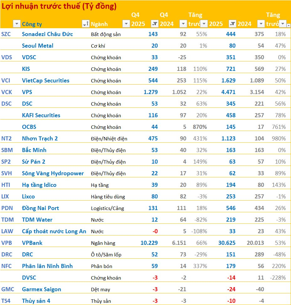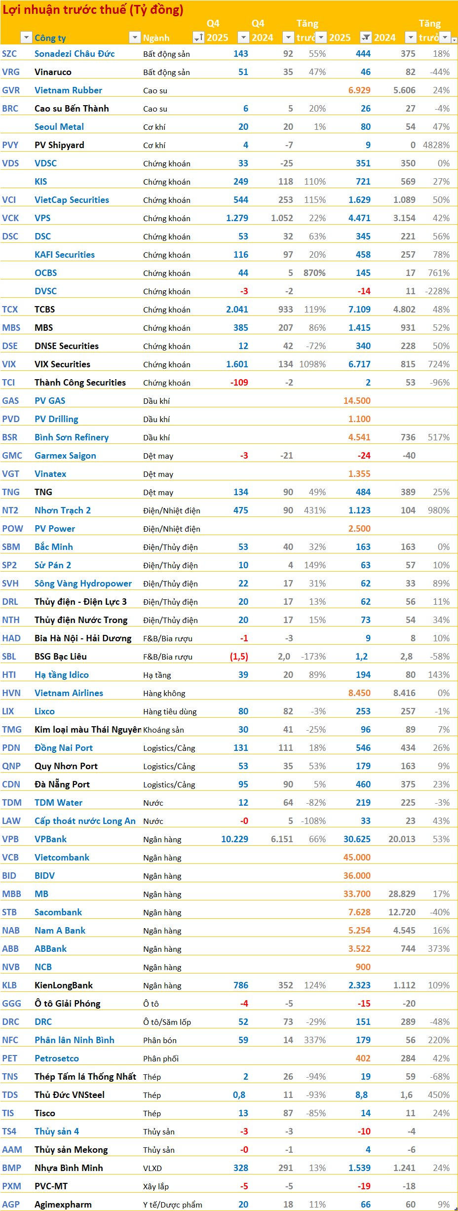 Các doanh nghiệp đã công bố BCTC quý 4/2025 và ước tính lợi nhuận năm 2025: