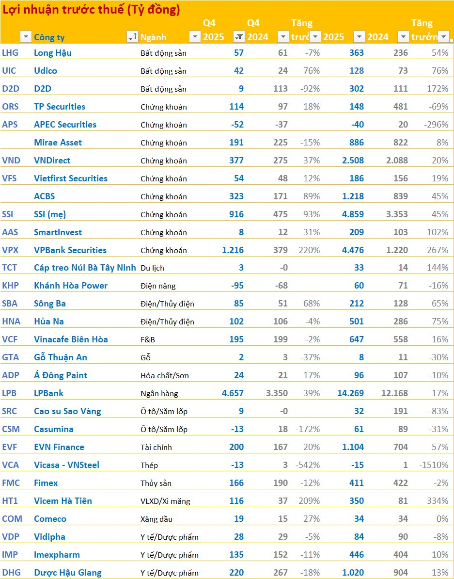 LPBank (LPB) báo lãi trước thuế quý 4 đạt 4.657 tỷ đồng, tăng trưởng 39% so với cùng kỳ. Lũy kế cả năm 2025, LPBank ghi nhận mức lãi 14.269 tỷ đồng.