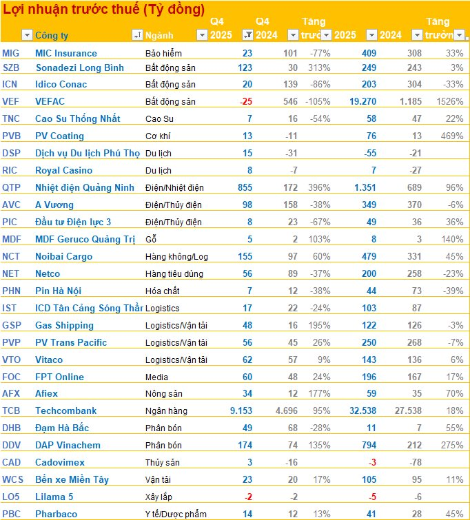 Các doanh nghiệp đã công bố BCTC quý 4/2025 tính đến ngày 21/1: