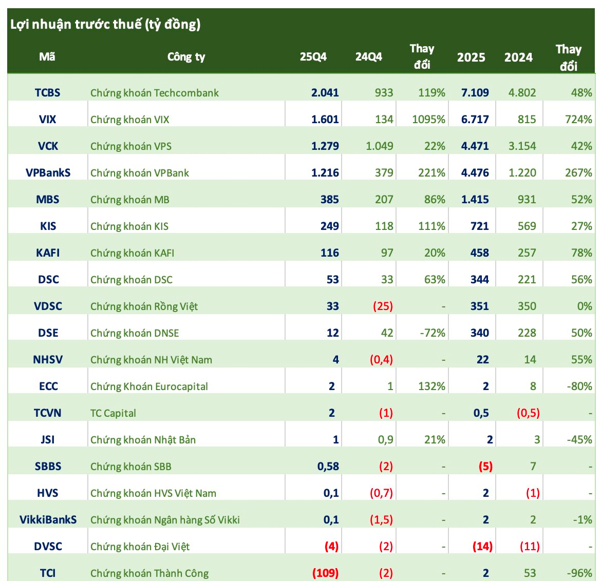 Chứng khoán KIS là cái tên tiếp theo trong nhóm chứng khoán báo lãi tăng bằng lần. LNTT quý 4 tăng 111% so với cùng kỳ lên 249 tỷ, đưa LNTT cả năm 2025 lên 721 tỷ, tăng 27%.