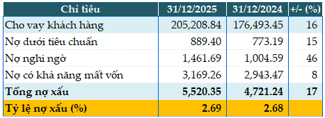 Tổng nợ xấu tính đến 31/12/2025 tăng 17% so với đầu năm, lên 5,520 tỷ đồng. Tỷ lệ nợ xấu/dư nợ tăng nhẹ từ mức 2.68% lên 2.69%. Tỷ lệ nợ xấu hợp nhất đạt 1.82%.