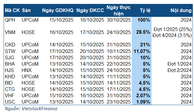 Nhiều doanh nghiệp trên UpCOM và HOSE sắp trả cổ tức tiền mặt trong tháng 10–11/2025, phổ biến ở mức 5–13%, tạo thêm nguồn thu ổn định cho nhà đầu...