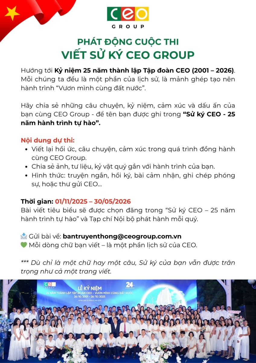 Hướng tới Kỷ niệm 25 năm thành lập (2001 – 2026), Tập đoàn CEO chính thức phát động cuộc thi viết “Sử ký CEO Group” – hoạt động ý nghĩa nhằm ghi lại những câu chuyện, cảm xúc và dấu ấn của mỗi thành viên trong hành trình “Vươn mình cùng đất nước”.