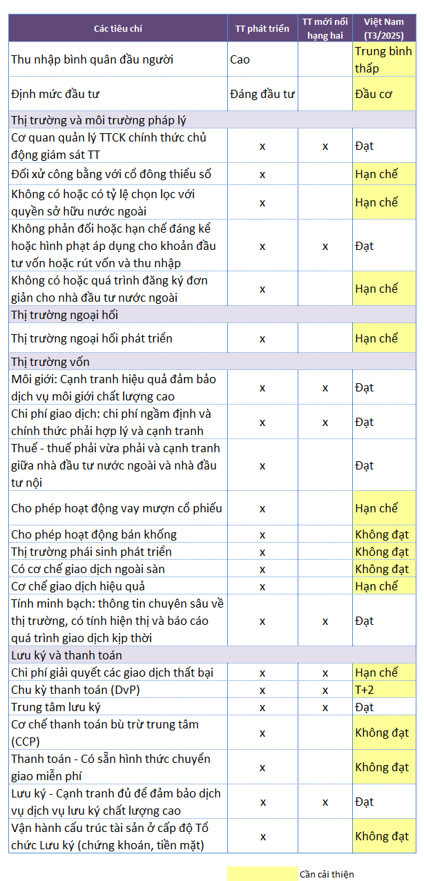 Đồng thời, quy mô và thanh khoản thị trường phải đạt chuẩn ít nhất 5 công ty đáp ứng các tiêu chí của Chỉ số Tiêu chuẩn (Standard Index) trong 8 kỳ đánh giá gần nhất. Các tiêu chí này bao gồm: vốn hóa thị trường tối thiểu 5.9 tỷ USD; vốn hóa cổ phiếu lưu hành tự do tối thiểu 2.9 tỷ USD và tỷ lệ vòng quay giá trị giao dịch hàng năm (ATVR) đạt 20%.