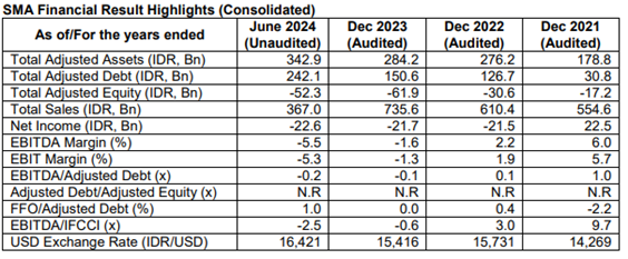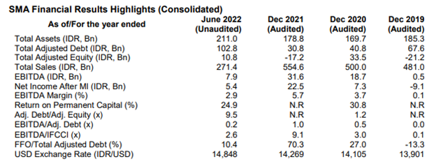 Trước giai đoạn này, tổng tài sản của SMA ở mức 211 tỷ Rupiah (tương đương 12.6 triệu USD), tổng doanh thu 271 tỷ Rupiah (tương đương 16.3 triệu USD) và lợi nhuận trước thuế, lãi vay và khấu hao (EBITDA) ở mức 7.9 tỷ Rupiah (tương đương 456 ngàn USD).