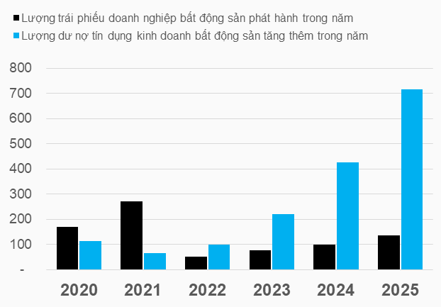 Nguồn: Dữ liệu trái phiếu doanh nghiệp từ VBMA; dữ liệu dư nợ tín dụng kinh doanh bất động sản do người viết tổng hợp