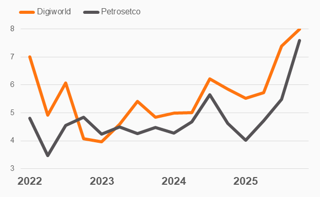 Doanh thu của Digiworld và Petrosetco trong giai đoạn 2022-2025 Đvt: Ngàn tỷ đồng