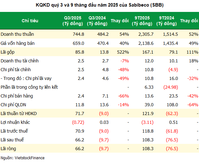 Trong quý 3/2025, doanh thu Sabibeco tăng 54% so với cùng kỳ, đạt gần 745 tỷ đồng. Riêng doanh thu từ công ty mẹ – Sabeco chiếm tới 90%, tương đương hơn 671 tỷ đồng. Biên lãi gộp cải thiện mạnh, đạt 11.5%, thay vì 2.5% cùng kỳ.