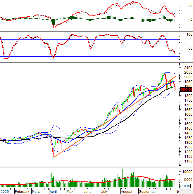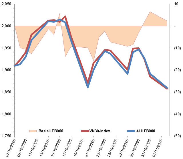 Trong phiên giao dịch ngày 03/11/2025, hợp đồng 41I1FB000 mở cửa với nhịp tăng nhẹ nhưng nhanh chóng suy yếu khi phe Short chiếm ưu thế khiến I1FB000 lao dốc nhưng lực mua quay trở lại giúp hợp đồng này hồi phục và bật tăng trong nửa cuối phiên sáng. Bước sang phiên chiều, áp lực bán một lần nữa quay lại áp đảo làm cho I1FB000 đảo chiều giảm sâu về cuối phiên. Kết phiên, I1FB000 dừng tại 1,860, giảm hơn 32 điểm.