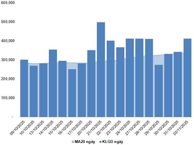 Khối lượng và giá trị giao dịch của thị trường phái sinh lần lượt tăng 20.34% và 18.98% so với phiên ngày 31/10/2025. Cụ thể, khối lượng giao dịch I1FB000 tăng 20.02% với 410,292 hợp đồng được khớp lệnh. Khối lượng giao dịch của I2FB000 đạt 456 hợp đồng, tăng 12.04%.