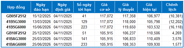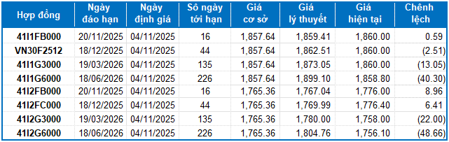 Dựa trên phương pháp định giá hợp lý với thời điểm khởi đầu ngày 04/11/2025, khung giá hợp lý của các hợp đồng tương lai đang được giao dịch trên thị trường được thể hiện như sau:
