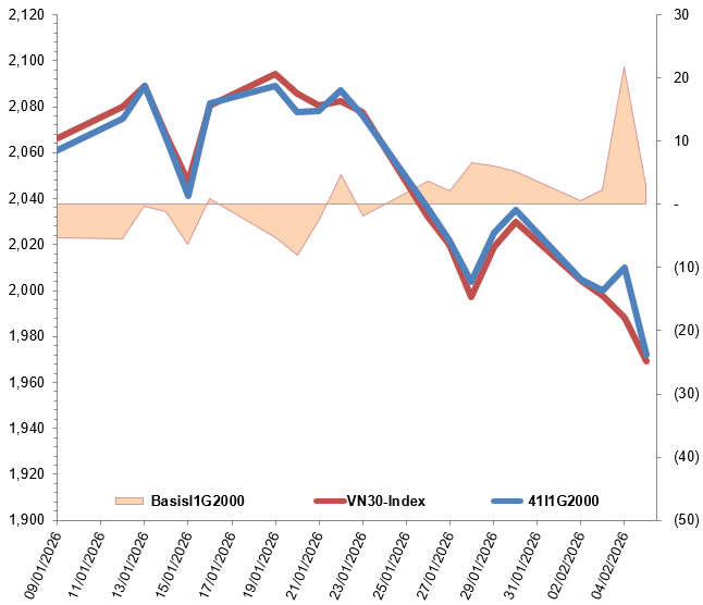 Các hợp đồng tương lai VN30 và VN100 hầu hết đều giảm trong phiên giao dịch ngày 05/02/2026. VN30-Index giảm 4 phiên liên tiếp đồng thời nằm dưới đường trendline tăng trung hạn cho thấy tâm lý khá bi quan của nhà đầu tư vẫn còn.