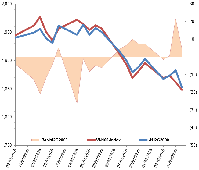 Ngoài ra, các hợp đồng tương lai VN100 hầu hết đều giảm trong phiên giao dịch ngày 05/02/2026. Cụ thể, 41I2G2000 (I2G2000) giảm 1.63%, còn 1,852.1 điểm; 41I2G3000 (I2G3000) giảm 1.42%, còn 1,850.2 điểm; hợp đồng 41I2G6000 (I2G6000) dừng ngay mốc tham chiếu, đạt 1,879 điểm; hợp đồng 41I2G9000 (I2G9000) dừng ngay mốc tham chiếu, đạt 1,865.7 điểm. Chỉ số cơ sở VN100-Index kết phiên ở mức 1,847.81 điểm.