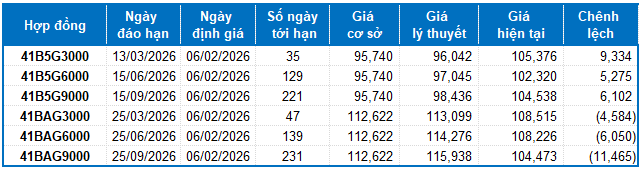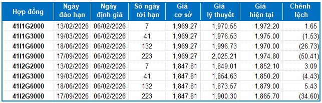 Dựa trên phương pháp định giá hợp lý với thời điểm khởi đầu ngày 06/02/2026, khung giá hợp lý của các hợp đồng tương lai đang được giao dịch trên thị trường được thể hiện như sau: