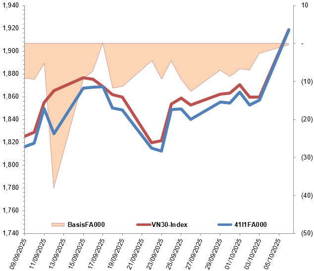 Các hợp đồng tương lai đồng loạt tăng điểm trong phiên giao dịch ngày 06/10/2025. Cụ thể, 41I1FA000 (FA000) tăng 3.32%, đạt 1,918.6 điểm; 41I1FB000 (FB000) tăng 3.07%, đạt 1,917 điểm; hợp đồng VN30F2512 (F2512) tăng 3.13%, đạt 1,913 điểm; hợp đồng 41I1G3000 (G3000) tăng 2.75%, đạt 1,886 điểm. Chỉ số cơ sở VN30-Index kết phiên ở mức 1,918.97 điểm.