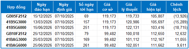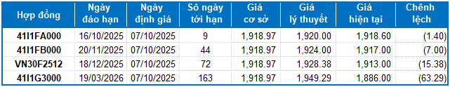 Dựa trên phương pháp định giá hợp lý với thời điểm khởi đầu ngày 07/10/2025, khung giá hợp lý của các hợp đồng tương lai đang được giao dịch trên thị trường được thể hiện như sau: