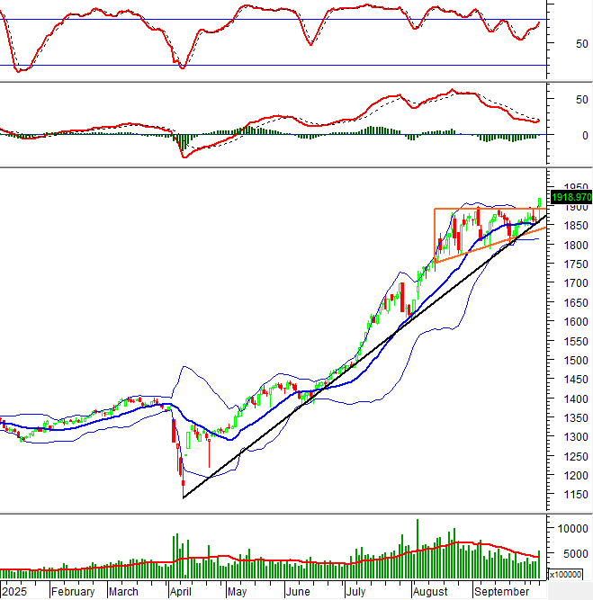 Hiện tại, chỉ số đã phá vỡ cạnh trên (tương đương vùng 1,875-1,900 điểm) của mẫu hình Ascending Triangle trong bối cảnh chỉ báo MACD tiếp tục thu hẹp khoảng cách với đường Signal. Nếu chỉ báo cho tín hiệu mua trở lại trong các phiên tới thì xu hướng tăng trung hạn sẽ càng được củng cố thêm.