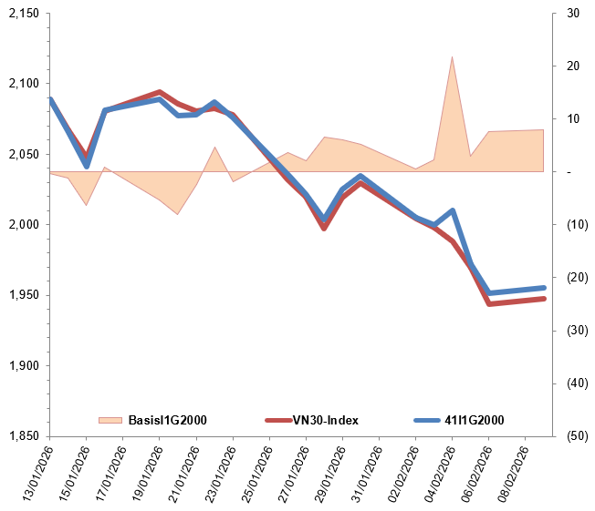 Kết phiên, basis hợp đồng I1G2000 mở rộng so với phiên trước đó và đạt giá trị 7.95 điểm. Điều này cho thấy tâm lý nhà đầu tư đã lạc quan hơn.