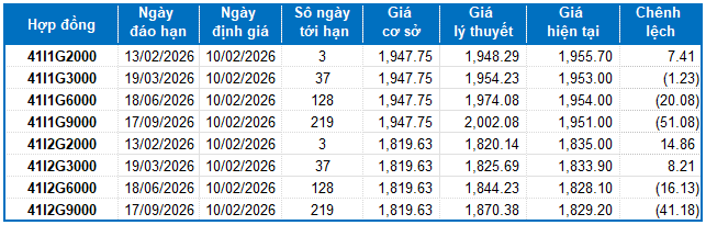 Dựa trên phương pháp định giá hợp lý với thời điểm khởi đầu ngày 10/02/2026, khung giá hợp lý của các hợp đồng tương lai đang được giao dịch trên thị trường được thể hiện như sau:
