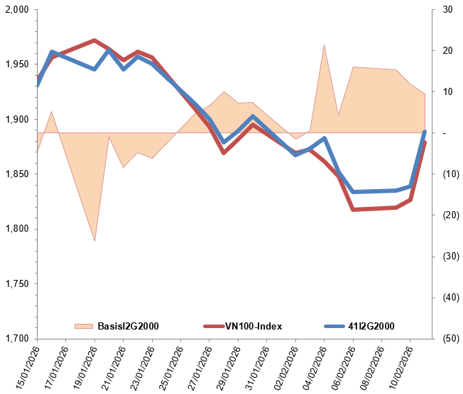 Ngoài ra, các hợp đồng tương lai VN100 đồng loạt tăng điểm trong phiên giao dịch ngày 11/02/2026. Cụ thể, 41I2G2000 (I2G2000) tăng 2.71%, đạt 1,888.8 điểm; 41I2G3000 (I2G3000) tăng 6.09%, đạt 1,880.1 điểm; hợp đồng 41I2G6000 (I2G6000) tăng 2.58%, đạt 1,882 điểm; hợp đồng 41I2G9000 (I2G9000) tăng 2.33%, đạt 1,888 điểm. Chỉ số cơ sở VN100-Index kết phiên ở mức 1,879.24 điểm.