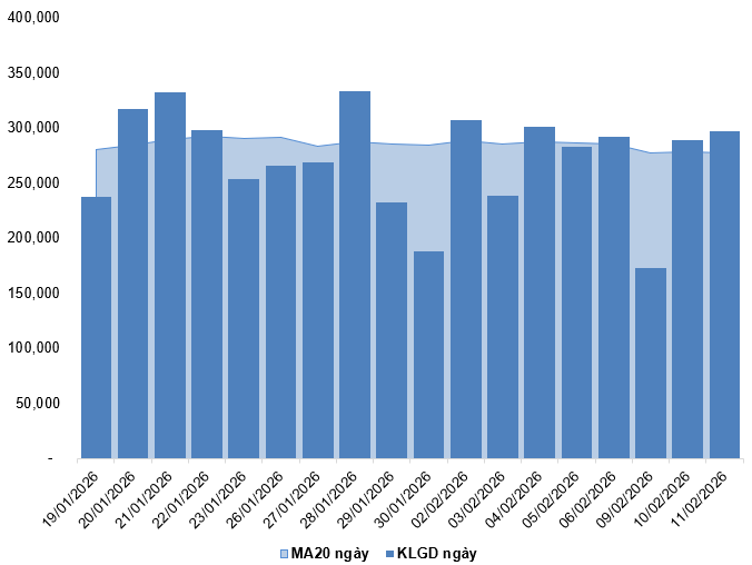 Trong phiên giao dịch ngày 11/02/2026, VN30-Index tăng điểm đồng thời xuất hiện mẫu hình nến Big White Candle kèm theo khối lượng giao dịch có sự gia tăng và nằm trên mức trung bình 20 phiên cho thấy tâm lý khá lạc quan của nhà đầu tư.