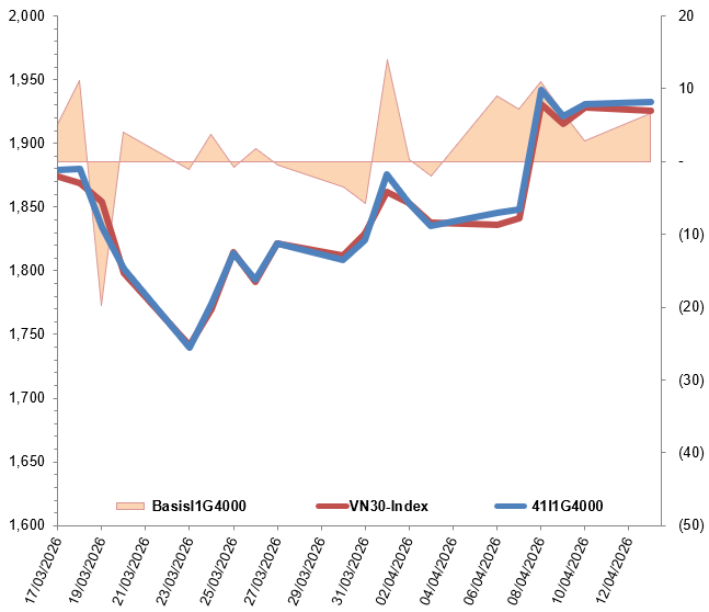 Kết phiên, basis hợp đồng I1G4000 mở rộng so với phiên trước đó và đạt giá trị 6.54 điểm. Điều này cho thấy tâm lý nhà đầu tư đã lạc quan hơn.